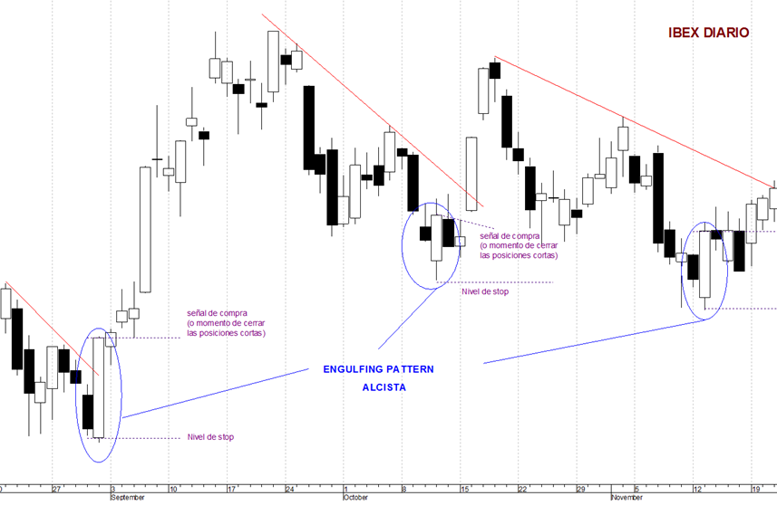 Cuando el mercado está en tendencia bajista, aparece una vela blanca cuyo cuerpo cubre todo el cuerpo de la vela anterior negra. Lo “engloba o envuelve”. Significa que tras una continuación a la baja (apertura bajista), la fuerza compradora consigue superar a a la vendedora y evoluciona con fuerza al alza, a lo largo de la sesión, hasta conseguir un cierre positivo.