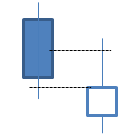 • la apertura de la segunda vela se produce por debajo del mínimo de la vela anterior,  (es decir por debajo de la sombra inferior).