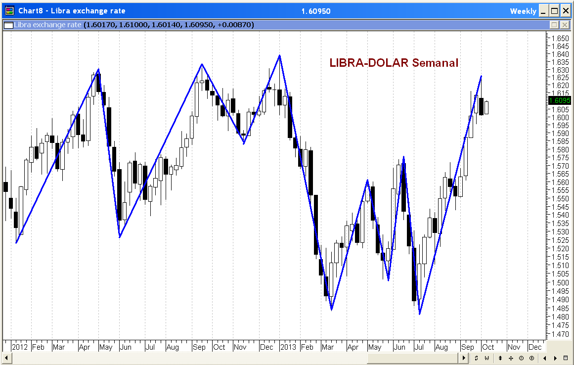 Y el gráfico siguiente muestra como se ve en realidad un mercado en rangos, y por tanto sin tendencia definida. Se trata de la Libra contra el Dolar a nivel semanal: