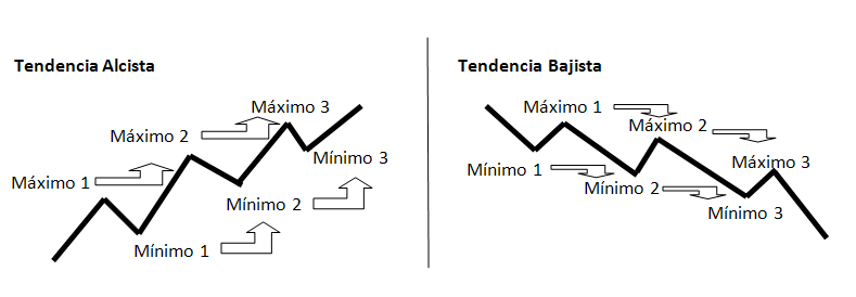 Cuando tenemos una secuencia de máximos crecientes, y mínimos también crecientes, se dice que nuestro mercado está en tendencia alcista.