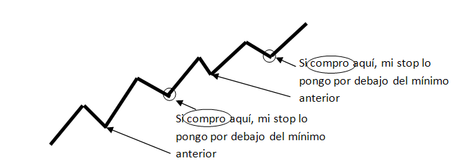 Porque una vez localizo la tendencia, puedo definir si soy comprador o vendedor con facilidad. Además se que los movimientos contra la tendencia los debo utilizar para abrir posiciones. Si estoy en una tendencia alcista, y el mercado está corrigiendo, una vez decido comprar, puedo utilizar el mínimo anterior como nivel de referencia para situar mi “stop. (De la misma manera, si estoy en una tendencia bajista y el mercado recupera, se que debo estar buscando la oportunidad de vender, y que una vez lo haga, el máximo decreciente anterior representa mi primera referencia a la hora de fijar el “stop” de la posición). Gráficamente se vería así: