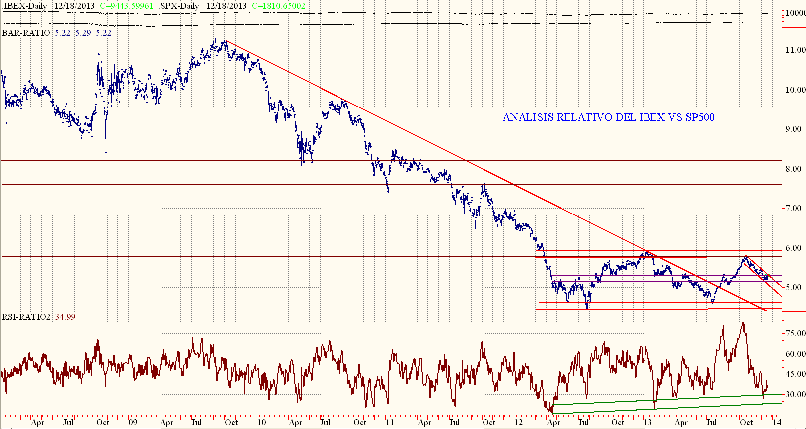 El análisis muestra una ruptura de tendencia que llevaba años marcando la evolución a favor de la bolsa americana frente a la española. Dicha tendencia se ha roto este verano., y hemos asistido a un fase impulsiva clara a favor del IBEX que se ha estrellado contra los máximos de 2012, sin poder superarlos. El proceso correctivo que hemos visto a continuación nos ha llevado de nuevo hasta la zona media del rango lateral, y a un 50% de corrección de Fibonacci de la última fase impulsiva. Además hay un área pivote situada justo en el nivel intermedio y que he dibujado de color morado. El RSI ha rechazado la directriz alcista que une los mínimos desde principios de 2012. Creo que hay probabilidades de ver otra reacción favorable al IBEX durante las próximas semanas. Espero un nuevo ataque a máximos de este año, lo que representaría que el IBEX lo haga un 10% mejor que el SP500.